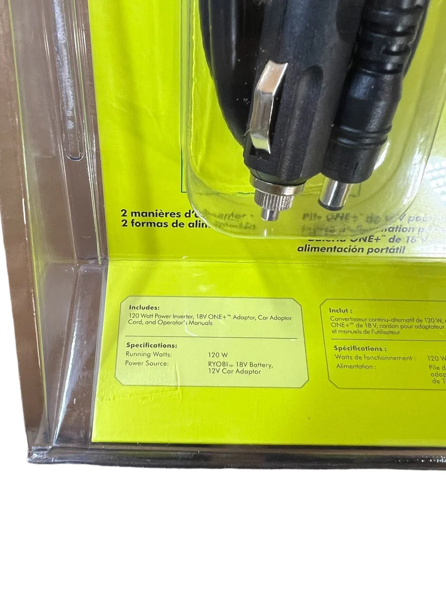 The RYOBI ONE+ 18V/12V Power Inverter provides convenient power whether you are in the car or on-the-move. With 120-Watt of continuous output, this inverter is perfect for powering laptops, tablets, cell phones and other small devices. It is the first in the industry capable of drawing power from either a 12V car power port, or, from one of your RYOBI 18V batteries. The compact and lightweight design is compatible with all of your existing RYOBI 18-Volt ONE+ batteries. Equipped with one 120V outlet and two USB-A ports, we have you covered when it comes to charging and powering at your convenience.